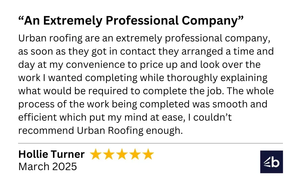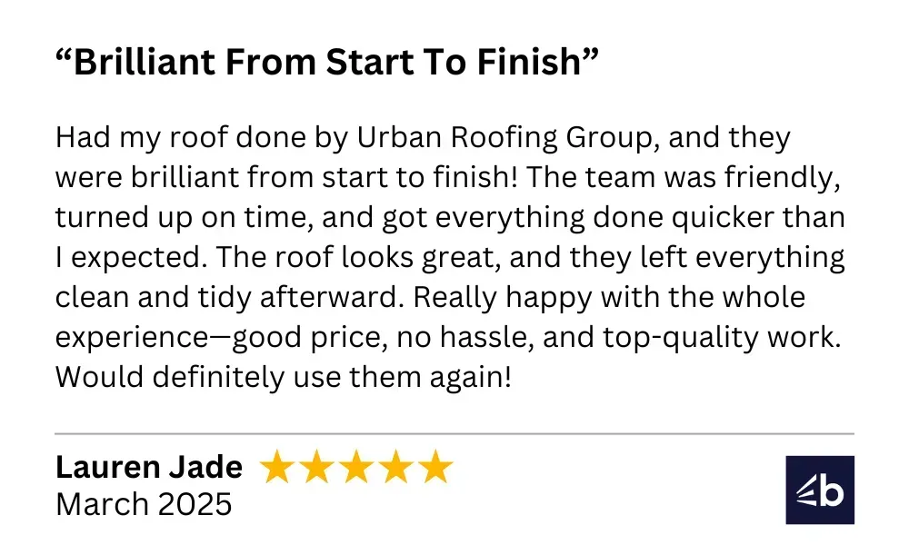 We’re proud of our 5-star reviews on Bark and Rated People, reflecting our commitment to honesty, transparency, and quality on every project. While many companies offer domestic roofing services, very few match Urban Roofing Group Ltd’s reputation for meticulous workmanship and exceptional customer service - all at a fair, sensible price.